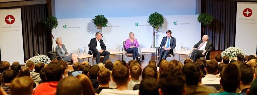 Zürich, 21.11. 2013 – Vor kurzem war ich zu Gast bei einer Podiumsdiksussion an der Hochschule St. Gallen, zusammen mit Ex-Bundesrat und Nationalrat Christoph Blocher; Frau Monika Ribar, Verwaltungsrätin bei Swiss International Airlines; Dr. Christoph Frei Professor für Ideengeschichte und Internationale Beziehungen an der HSG und moderiert von der Wirtschaftsredaktorin Frau Marianne Fassbind – anlässlich der dort stattgefundenen Consulting Days.