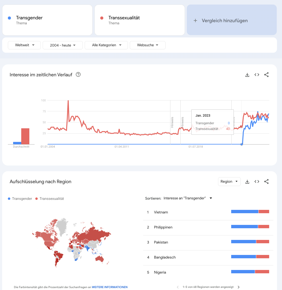 Jedoch tat sich dann ein Narrativwechsel auf: Das Thema Transgender kam tatsächlich erst ab dem März 2023 auf das Trapez, davor war es quasi in den Medien weltweit kaum verbreitet, s. Google Trends, das Thema Transsexualität war bereits vorher immer ein mal mehr oder weniger dominierendes Thema.