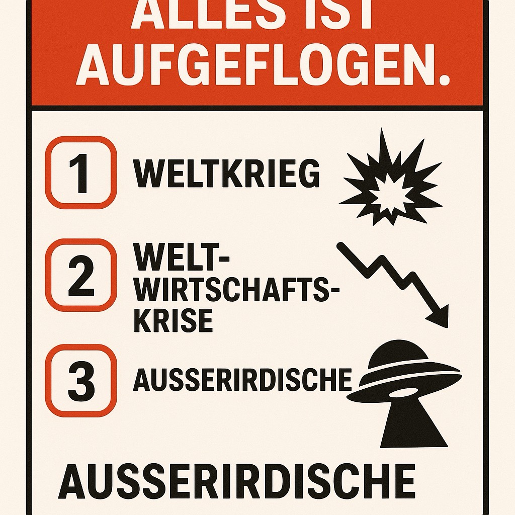 Knopf 3: Außerirdische. Der Joker. Wenn die Realität keine Ausreden mehr hergibt, müssen eben fantasierte Ufos herhalten. „Blue Beam“ ist dabei weniger Verschwörung und mehr verzweifeltes dramaturgisches Restmaterial: Man wirft alles an die Wand und schaut, ob etwas kleben bleibt. Und seien es Marsmenschen auf PowerPoint.