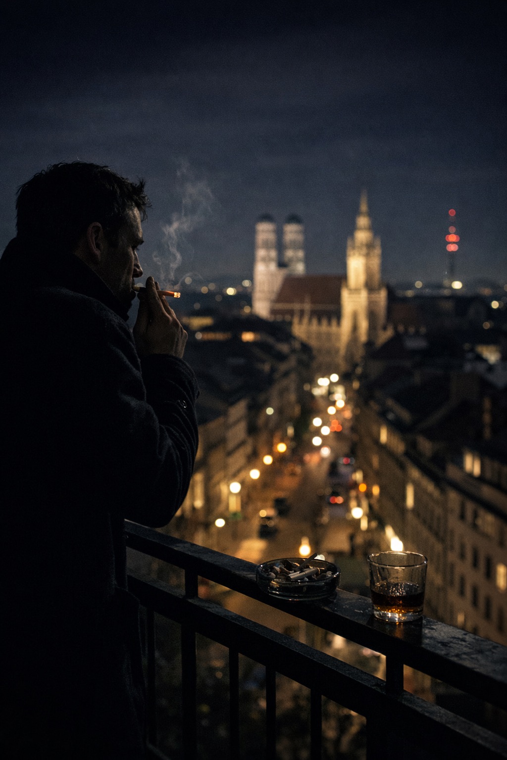 Die Stadt liegt ruhig unter mir. München schläft früh, selbst wenn es wach ist. Ein paar Lichter in den Fenstern gegenüber, irgendwo ein verspäteter Bus, der so tut, als hätte er noch eine Aufgabe. Der Rest ist Ordnung. Beton, Glas, geregelte Verhältnisse.