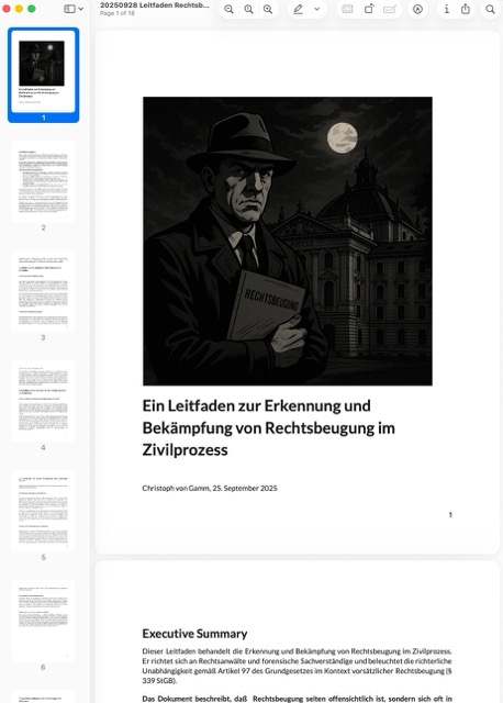 Dieser Leitfaden behandelt die Erkennung und Bekämpfung von Rechtsbeugung im Zivilprozess. Er richtet sich an Rechtsanwälte und forensische Sachverständige und beleuchtet die richterliche Unabhängigkeit gemäß Artikel 97 des Grundgesetzes im Kontext vorsätzlicher Rechtsbeugung (§ 339 StGB).